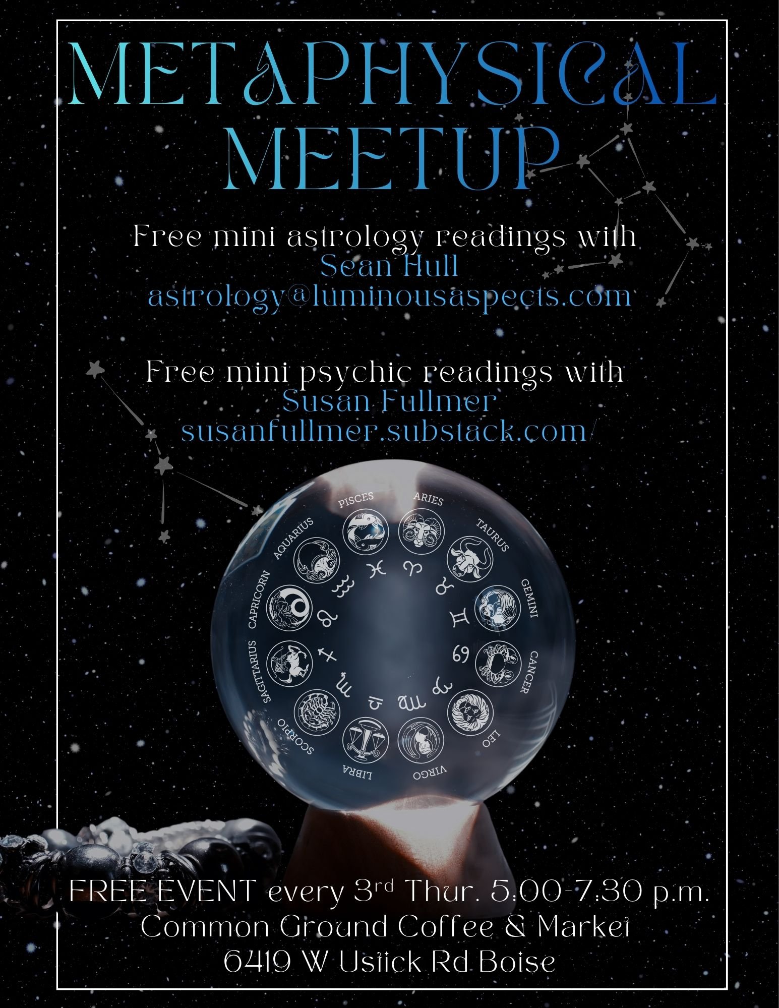 EVENTS MONTHLY AND SPECIAL EVENTS TIPPING INFO BELOW Metaphysical Meetup-3rd Thursdays @Common Ground Coffee and Market 5:00-7:30 Tips Welcome (VENMO LINK)
